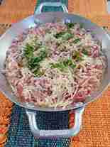 Arroz branco, carne seca desfiada, catupiry, creme de leite culinário, caldo de legumes, parmesão, salsinha e pimenta do reino moída