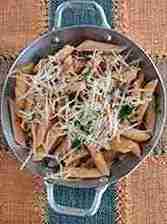 Massa penne, molho de tomate, alho, manjericão, molho de pimenta, azeite, orégano, parmesão, salsinha e pimenta do reino moída